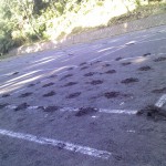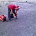 芝生が植えられない公園の多目的広場の岩板を「振動ドリル」で開ける作業を日没まで行った。 手に豆ができた!