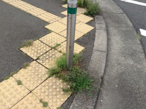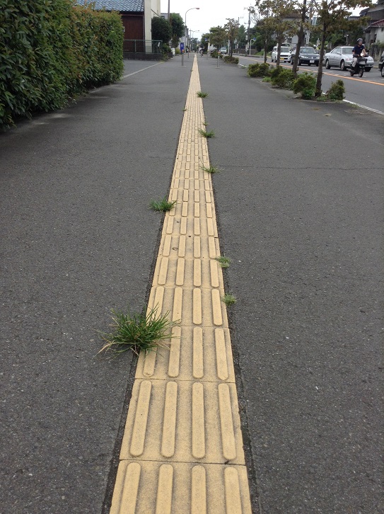 座間市役所前の通りの歩道に敷き詰められている「視覚障碍者誘導用ブロック」に草が点々と生い茂っていて怖いので刈り取ってほしいとの連絡が視覚に障害のある方から直接連絡を頂いた。