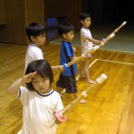 (写真 稽古をする子供たち、昔の小太刀、短剣道竹刀)