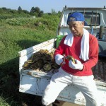 (写真 ヒマワリ収穫風景と乾燥、脱粒作業風景)