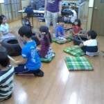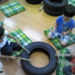 (写真 タイヤを太鼓の代用で毎週お稽古しているよ! 夏祭りには欠かせないお囃子の子ども達)