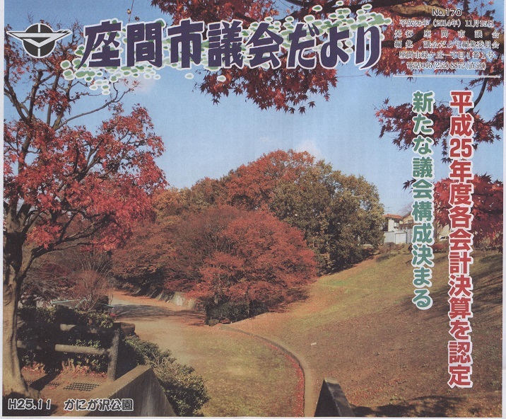 11月19日(月) 議会だより編集委員会の委員長に就任し、はじめての議会だよりの発行。表紙を飾るのは「かにが沢公園の紅葉」 主の項目は、平成25年度各会計決算の認定。新たな議会構成がきまる。 1ページ 新議長、副議長 就任あいさつ 2ページ 総括質疑 3ページ 討論 4ページ 一般質問 5ページ 一般質問 請願・陳情の結果 6ページ 一般質問 委員会の動き 7ページ 決議・意見書 8ページ 座間市議会役職一覧表(新) 9月定例会審議結果