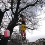 (写真 つぼみが開花したカニが沢の桜、提灯をつける学生とじゅんろう)