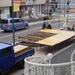 今週末からはじまる、相鉄線さがみ野駅北口の桜まつりの舞台設置作業が本日から行われています。