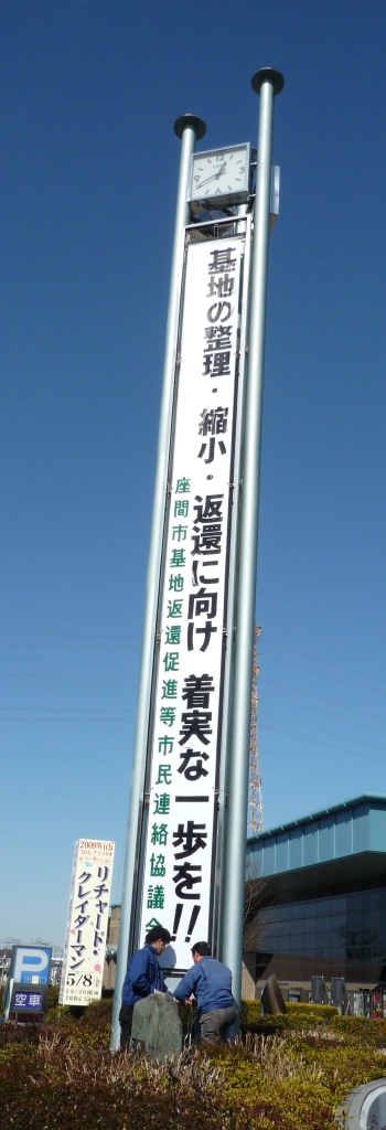 現在、キャンプ座間一部が返還され、病院施設、公園、自衛隊家族宿舎が建設されるさなか、市役所前に設置されている懸垂幕の設置に関して不要か不必要かという議論が厚く議論された。戦前から軍都の歴史をもつ座間市において、基地と上手く向き合っていくか、それとも、さらに基地の縮小を国に訴え懸垂幕の撤去を希望するか❔意見は真っ二つに割れている。あなたの考えはどちらでしょうか❔