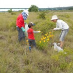 (写真 オオキンケイギクの駆除作業とマリーゴールドの定植作業)