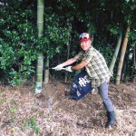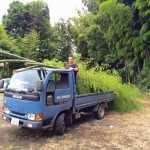 (写真 竹を取るじゅんろうと トラックに積載した竹をベイマックス君)