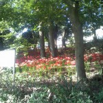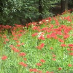 北海道から琉球列島まで見られるが、自生ではなく、中国から帰化したといわれる彼岸花(ひがんばな)がかにが沢公園西側に咲き乱れている。