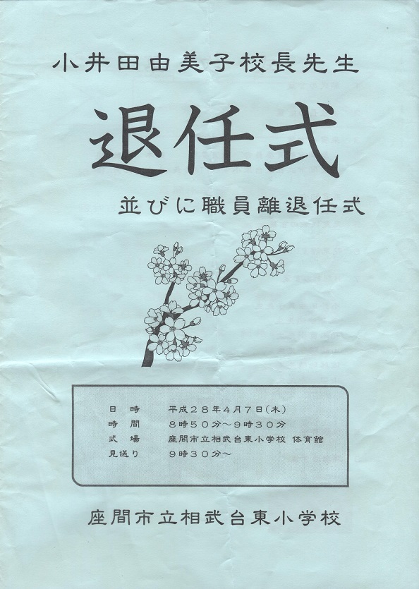 本日午前中は、今年で退職されます、相武台東小学校前校長、小井田由美子先生の離退任および、転勤となります先生方の式典に参列を致しました。 退職される小井田由美子前校長は、平成13年から地元相武台東小学校で勤務以来、子どもたちと地域交流(商店会)の課外事業を参入し、職業体験、市の花ひまわりを栽培し子どもたちのアイデアを生かした商品開発に取り組んだパイオニア的先生でした。