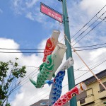 近年、環境の変化で、こいのぼりの掲揚が見られたくなってきています。そんな環境下、相鉄線さがみ野駅北口、みどりと桜の街「さがみ野商店会」では、地元とのボランティア「祭り工房」と近所の子供たちと協同して、鯉のぼり12匹を、商店会歩道に泳がせました。