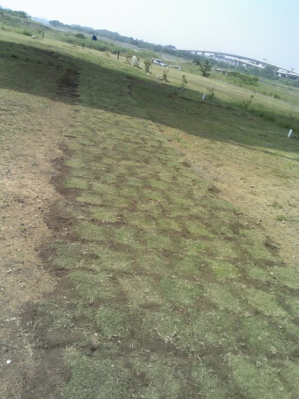 この芝生は、座間市役所公園課から寄付されたもので、「座架依橋」ちょうど橋下である暫定Bコースの64mのロングホール場所です。橋げたには、バーベキュー後のゴミが散乱しており、芝生の植え付けでゴミ捨てが減少すればと考えていますが・・・・・・・・ 難しいかな!