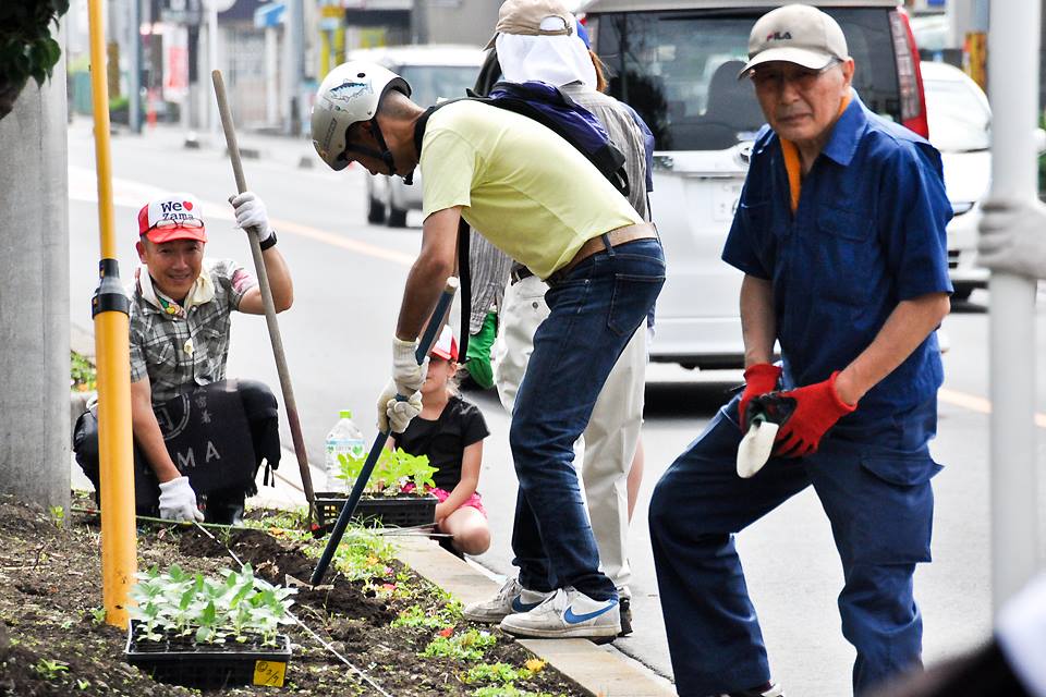 (写真 赤いヒマワリ苗植え付け作業をするボランティア達!!)
