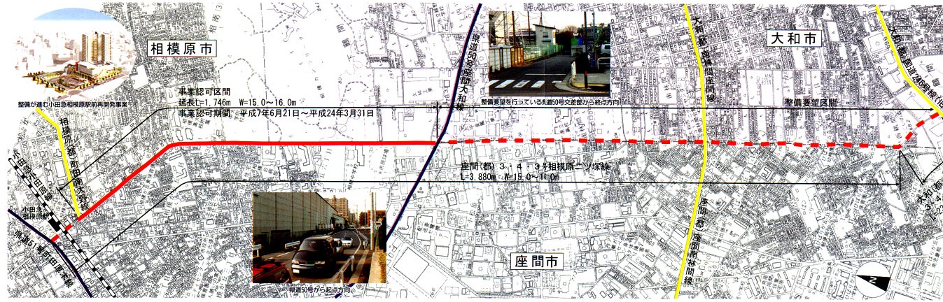 この地域は、南北に連絡する幹線道路がなく、生活道路に通過交通が入り込むなどの問題が発生しており、交通安全上や地域防災面からも整備が望まれています。 そのため、小田急相模原駅前付近から県道50号(座間大和)までの区間について、事業を実施しています。