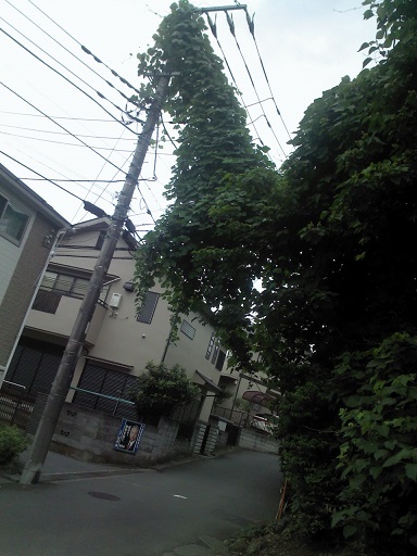 本日、緑ヶ丘3丁目の電柱を伝わり電線へと到達している葉枝があり危ないとの連絡を頂きました。現場を見てみると、枝葉は電線まで到達しておりました。