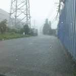 強風、豪雨のなか、毎回の被害を受ける市道38号線に直行。現在、道路整備、埋設管および側溝整備が行われている中