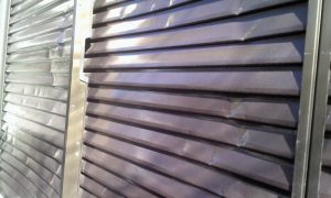 (写真 ちびっこ広場からのボールと被害雨戸)