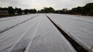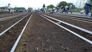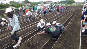 (写真 10年以上も前から続けられているヒマワリ栽培、防鳥対策は、大人のボランティアが発芽するまでシートをかぶせます)