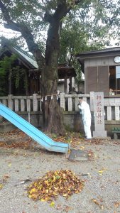 (写真 秋の気配 相武台神社の枯れ葉を掃除する氏子)