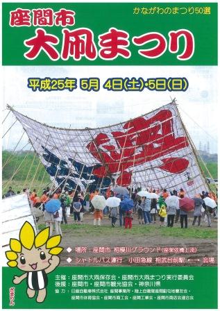 日本一の「座間大凧まつり」 開催は 5月4日・5日の2日間 午前10時~午後4時 さがみ川グランド河川敷 座架依橋上流 相模循環道開通により大変込み合います。電車、シャトルバスでの来場をお勧めいたします。 シャトルバスは小田急線相武台前駅北口から20分間隔にて運行(始発AM9:00)