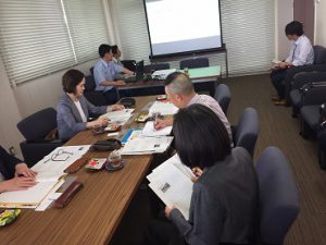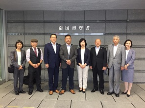 視察にあたり会議室において、消防団出身の南国市議会、岡崎純男議長から挨拶があり、座間市における全国消防団操法大会においての全国第2位を受賞されたことに対しまして敬意の意をこめてご挨拶を頂きました。今回の視察のメインであります「消防団の活動」の基礎となる南国市の消防団の団員数に関しましては、人口約4万7千人に対し、消防団員の定数が337名で、現在344名(女性11名含)の消防団員が活動しており、充足率は97.7%と高いものとなっています。この充足率に関しましては、退団が45歳と定められている座間市とは環境がちがい、南国市においては、退団者の歳が定められていないため、50歳以上でも継続できるとのことから、比較はできないものもありますが、南国市では、消防団退団後も後方支援として、部隊や消防団災害支隊などに参加をしOBが活動をしているとのことでした。座間市においても消防団OBで形成する「纏会(まとい会)」が近年発足をしている環境下、このあたりも防災活動として参考にして行く必要性はあるかもしれません。また消防団加入促進にむけて、在籍している女性消防団の皆さんが、保育園や幼稚園など、また小学校などで紙芝居などを行い防災の啓発を行っている他、平成25年より南国市少年消防クラブを形成し現在39名(小学生~高校生)が加入全国大会に出場し未来を見据えた消防団員加入促進および防災啓発を行っています。また、行政側としては、実際災害を経験している宮城県に注目をし、面積、海に面した環境や地形などを配慮にいれ、宮城県岩沼市と姉妹都市を締結し、防災に関する知識や防災のノウハウなどの情報交換を行政のみではなく、民間防災団体を含め市全体間でも行っているとの事です。