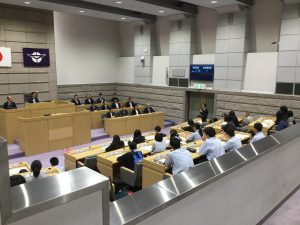 議場の見学では、代表生徒による質問、それに対する議員の方からの答弁といった内容の模擬議会を開催しました。