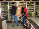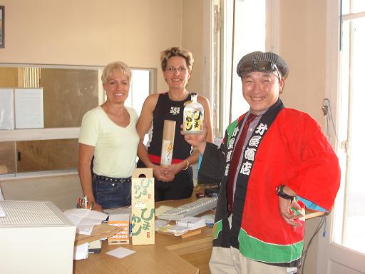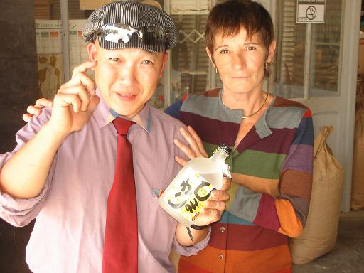 座間の特産ひまわり焼酎をもって農協の皆さんに挨拶。種の輸出に全面協力してくれたマダム・ローズ(中央) |