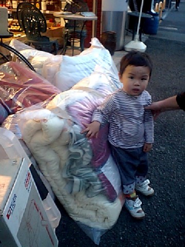 震災地へ、新しい布団、とても暖かい毛布、お年寄りのための厚い座布団10枚、新品の電子ポット2個、砂糖他、