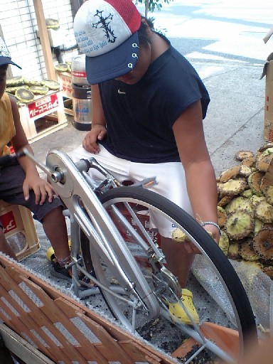 | ヒマワリ収穫の後のヒマワリ種の脱粒作業は大変だ! 収穫をしたヒマワリを乾燥後 ある時は、棒でたたき種をとる(キルギスタン方)や またある時は、網袋に入れてマンションの5階から落下させる、 そして、木箱に入れて爆竹でぶっ飛ばす しかし・・ヒマワリの種を簡単に脱粒することが出来なかった、 そんな退屈な作業をしていた子供達が ある日、空回りした自転車の後輪のスポ^−クに 乾燥されたヒマワリを投げ込む子供の姿が!! これだ!! 自転車を逆さにして誕生した 脱粒機「クルクル君」はこのようにして生まれたのである。 クルクル君は、緊急自動ブレーキが 設置されています。 |