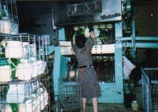 トスカーナの藁に包まれた瓶を洗流機にかける