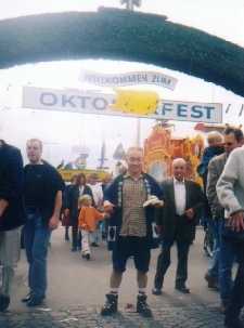 世界最大のビール祭り会場に、トレードマークのマスヤ酒店の半てんと坊主頭にサングラス、世界中から6万5000人以上の酔っ払いが参加した、20世紀最後のビールの祭典オクトーバーフェスト会場(テレージエンヴィーゼ)の正面門に立つ勇気あるサムライ・ドランカー日本人“ジュンロウ”。