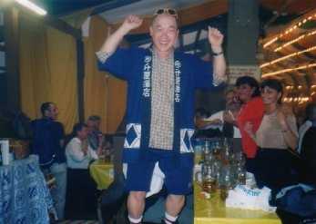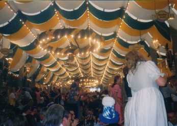 *レーベンブロイ・ブロー*2000年10月1日(日曜日)雨昨夜は、、エンジョイそしてかなり飲み過ぎポケットの中の財布が盗まれたのをきずかず、ホテルに帰宅、一夜明け,やや疲れ気味の体に鞭をたたき、コリコリのベーコン、バイエルン名物の小柄なソーセージで食事をとる。その後すぐ電話を使い、盗まれた財布の中に入っていたクレジットカード(VISA)を他人が使用で出来ないよう無効。そして盗難証明書をもらいにミュヘン警察署を訪れたそこには、昨夜、喧嘩して血だらけの男が数人イスにすわり眠っていた。午前中やる事をすべてスピィーディーに行い、独りますや酒店のハッピを着てドイツの名門ビール・レーベンブロイのビアホールを訪れた。