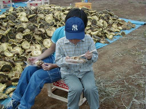 55万本のひまわりが咲き乱れる座間のひまわり畑、 座間のヒマワリの種を全て収獲したら7トンは取れる。先の見えない収獲作業で昼食を取る少年。“腹を空かしては戦はできぬ” まさに、ヒマワリ焼酎は子供達の力を借りずに完成しなかった特産品だ!! これではいけない!! 子供が泥だらけ 大人が楽しむだけでは!! |