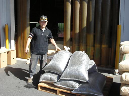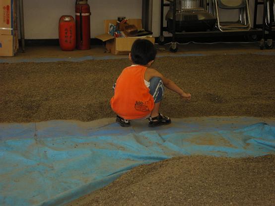 大量に残った200kgのヒマワリの種と淳郎(千代川村の搾油所にて)