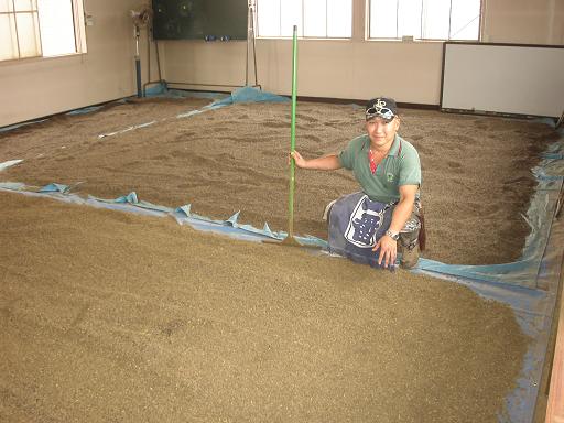 朝夕と毎日2回、ヒマワリの乾燥を促進するため、モップにより切り返し作業を行う。 室内は湿気を防ぐため24時間扇風機が回り、35度の焼酎を霧吹きにて散布する。