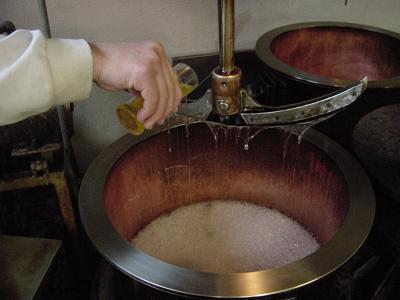 釜の中に水飴と砂糖、そしてヒマワリオイルを入れ、よく混ぜながら徐々に高温で煮詰めていく。 |
