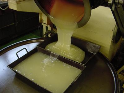 煮詰めた水飴を鉄で出来た冷却板に流し、60度くらいまで冷やす。