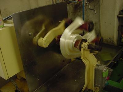 最新の高速回転製白機で念入りに飴を練る。 昔は人間の手で行っていたが、技術の進歩は凄い!!