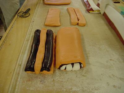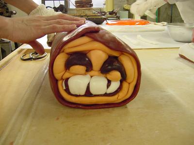 色付けし、製白機でよく練った飴を、手早く顔の各パーツに分けていく。