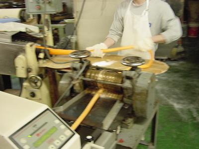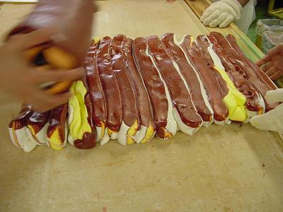 飴を棒状にのばす機械(バッチローラー)に入れ、口から出てきた飴を次のローラーで均一の太さにする作業。 巨大な“ひまわり君”は、パッチローラーで、なんと!!