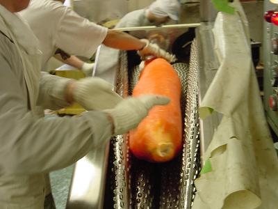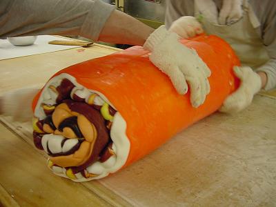 飴を棒状にのばす機械(バッチローラー)に入れ、巨大な“ひまわり君”をダイエット!! |