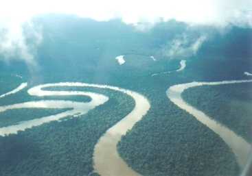 アマゾン川第2の大都市イキトスに着陸態勢に入った機内の窓から撮影した蛇行した川