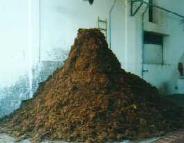 破砕されオガクズのように山済みされたアガベのカスは畑の肥料や豚のエサになる