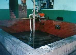 蒸して柔らかくなったアガベの株は破砕機で潰され左写真の共同銭湯のような石造りの発酵桶に流し込まれる。発酵桶に流し込まれたアガベの汁に温水と酵母を加えて約4日間アルコール発酵させた後、蒸留作業に入る。