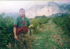 愛犬のシェパードと共にぶどう畑を管理している身長1m90cm以上ある元ロシア軍人の大男、マスカット・アレキサンドリアぶどうを片手にポーズをとるスラブヤニスコエさん。彼はこの外観で、非常にぶどうに詳しくワイン評論家であるのに