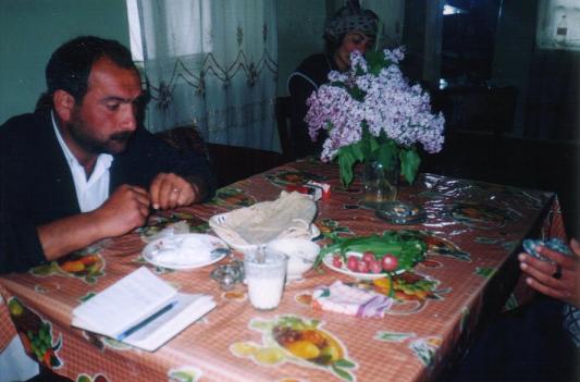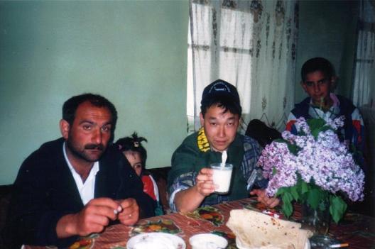 テーブルには本物のコーカサス料理が、(左から)“カトック”、“トゥオルク”、“ラバシ”、そして美しい花瓶にはいった美しい花。 メヘルバン少年は、僕がお酒を飲みたいといった、わがままな要求を自宅に招待してコーカサスのお酒をご馳走してくれたのである。 ここコーカサスには、貧しい中にも日本人が忘れかけた何かがある。 |