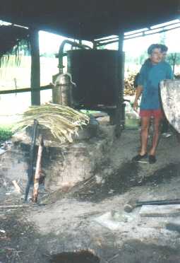 木彫の船の中でアマゾンの空気と自然酵母で発酵したアルコール8パーセント前後のサトウキビワインは、まず左写真の原始的な石で固められたブリキ製ポットに入れられる。底ではサトウキビの樹液が搾り出された樹皮を薪の変りに燃やしサトウキビワインを沸騰させる。サトウキビワインがアルコールの沸点78℃に達すると蒸気となり管を通り大きなドラム缶へと流れ込む。そしてブリキのポットの中は分離された水分だけが残る。