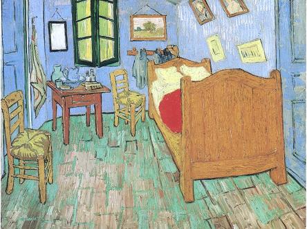 ゴッホは5月になると“黄色い家”と呼んだ建物にアトリエを構えた。彼はプロヴァンスに滞在した1年3ヶ月の間に200点を越す作品を描いた。アルルにて描いた代表作に“夜のカフェ”(同年9月)、ゴッホの寝室(左絵)、ラングロワ橋(飛跳橋)、アルルの夜などたくさんの名作を残している。