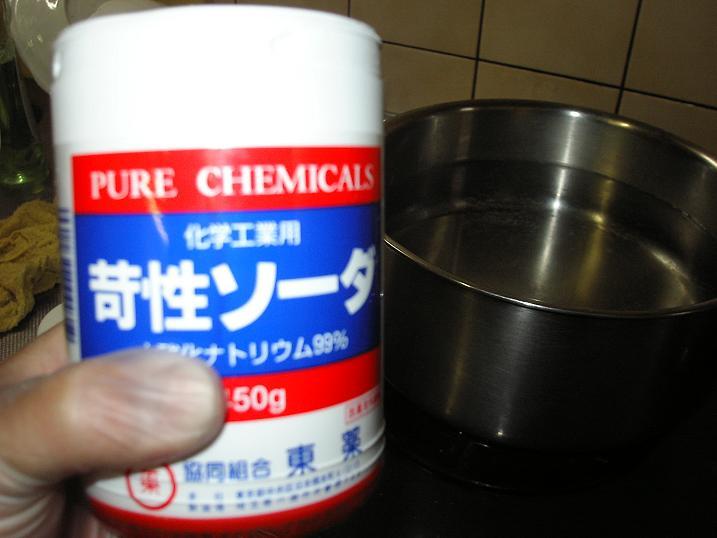 大鍋に水を貼り60度くらいのお湯になったら化成ソーダを入れよう天然石鹸やソーダ灰なら廃液は環境に優しいかもね! |