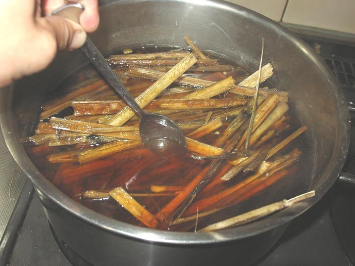 お湯が沸騰する手前でヒマワリの茎を鍋にいれて約1時間ぐらい煮込もう。化成ソーダとお湯で煮込むと紙に必要な“リグニン”や“ペクチン”質を取り除くことができる。 |