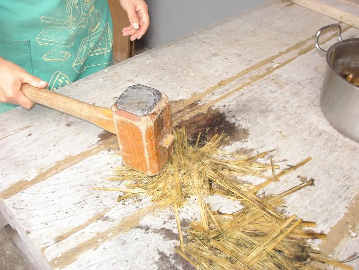 木槌を使い、ヒマワリの茎の繊維質を細かくしてミキサーにかける。 |